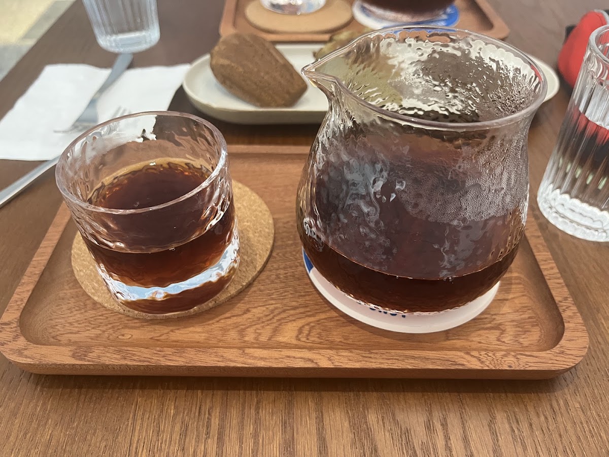 位於高雄鹽埕區大仁路 204 巷內的「Kissa Enso Vinyl Café」,是一間結合日式喫茶、黑膠唱片與 Hi-Fi 音響文化的獨立咖啡店。鹽埕區是高雄舊港邊的老靈魂地帶,唱片行、復古家具店與獨立咖啡店在巷弄間共生,Kissa Enso 正好落腳於這個氛圍之中。店內以深色木質牆面為主調,兩側佇立著大型藍色落地音箱,牆面與展示架上整排陳列黑膠唱片封面,吧台上擺著帶透明防塵罩的黑膠唱機——咖啡與音樂在這個空間裡被同樣認真地對待。手沖咖啡以錘紋玻璃分享壺盛裝,搭配簡單甜點與書本,水磨石地板、軌道燈與工業風管線共構出寧靜沉穩的午後氛圍,是走進去就想放慢時間、坐下來聽一張唱片配一杯手沖的那種店。
