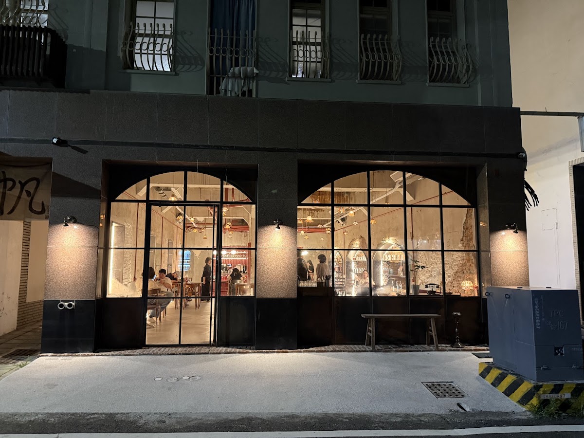 新美街上的深夜咖啡酒館,黑色拱形落地窗配上石材牆面,夜晚亮起燈來格外有氣氛。店內是工業風與復古的混搭——裸露水泥牆、紅磚吧台、多彩吊燈與天花板管線構成粗獷又迷人的空間。吧台上同時擺著手沖器具和威士忌,白天是珈琲、夜晚是酒場,下午兩點營業到凌晨兩點,週二公休。台南深夜想找一杯好咖啡或一杯調酒,新美街這扇拱門值得推開。
